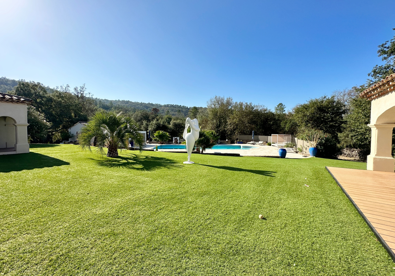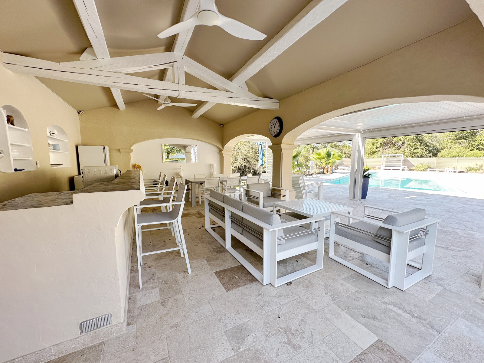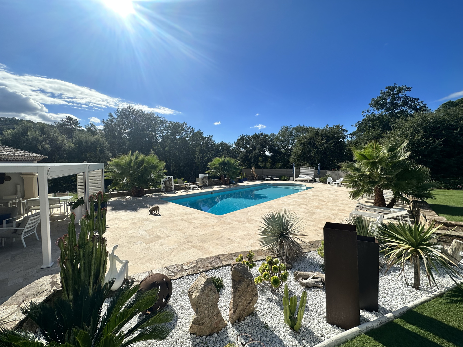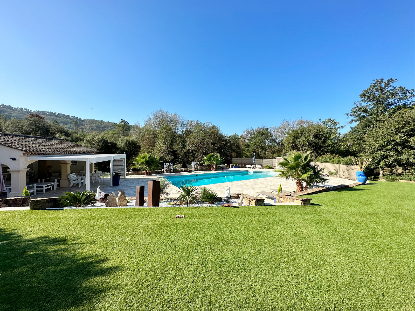Cette proprieté se situe dans un quartier recherché et sécurisé de la commune du Muy, près de Sainte Maxime dans un environnement verdoyant et calme sur un terrain de 11 504 m² : Elle est composée d'une villa de 186,77m² de standing entièrement rénovée avec goût et matériaux de qualité, très lumineuse comprenant : une entrée avec placard, un wc invité, une superbe pièce de vie de 50m² avec espace salon salle à manger et une cuisine ouverte entièrement équipée, une arrière cuisine / buanderie vient compléter cet espace. La partie nuit se compose de deux chambres, d'une salle d'eau avec wc et à l'étage d'une chambre avec salle de bains et wc. Sur la propriété se trouve également un studio indépendant avec sa salle d'eau et wc, ansi qu'une Maison d'invités indépendante comprenant : deux chambres, une cuisine équipée et une salle de bains avec wc. L' extérieur offre quant à lui de nombreuses terrasses et espaces de détente, une piscine de 16m x 6m avec pool house entièrement aménagé avec une cuisine d'été. La propriété comprend également un garage, un cabanon de rangement.